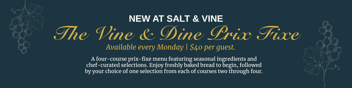 Looking for the perfect venue to host your special event? Salt and Vine is the ideal elegant restaurant for all types of private occasions. We host intimate gatherings and corporate events. Our experienced event planners will ensure every detail is perfect for your special occasion. Ask for a recommendation on wine pairings, or customize the menu to your preference. Our private dining options, including an intimate wine room and exclusive use of our outdoor patio. Enjoy succulent Italian cuisine in an elegant upscale setting.